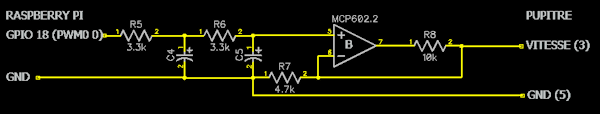 Le contrôle de la vitesse de rotation s’effectue par l’application d’une tension analogique comprise entre 0 et 5 V sur la broche 3 du connecteur. Le Raspberry Pi ne disposant pas de sortie analogique native, la tension de commande est générée à partir d’un signal PWM . Ce signal est ensuite filtré afin d’obtenir une tension continue proportionnelle au rapport cyclique, puis amplifié pour atteindre la plage 0–5 V. Un filtre passe-bas RC d’ordre 2 a été mis en place afin de lisser le signal PWM avant l’amplification. Le filtrage est constitué de deux cellules RC successives résistance 3.3kΩ/4.7uF et 3.3kΩ/1uF. N’ayant que des capas chimiques avec ces valeurs, c’est ce que j’ai utilisé pour le proto. Pour l’amplification, j’ai profité de l’AOP resté dispo sur le MCP602 mais cette fois ci monté en ampli non inverseur avec un gain de ~1.5 avec une paire de résistance 10kΩ, 4.7kΩ.