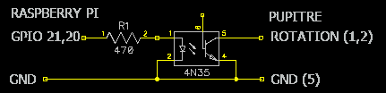 La commande du sens de rotation est réalisée au moyen d’optocoupleurs 4N35 . Chaque optocoupleur est piloté par une broche GPIO du Raspberry Pi configurée en sortie. La LED interne de l’optocoupleur est alimenté via une résistance de 470 Ω. Cette valeur limite le courant à environ 5 mA, ce qui est suffisant pour assurer la saturation du phototransistor de sortie dans les conditions d’utilisation prévues (charge faible côté sortie). L’utilisation de simples transistors NPN montés en commutation aurait également permis de remplir cette fonction mais j’ai mis la main sur les optos en premier ….